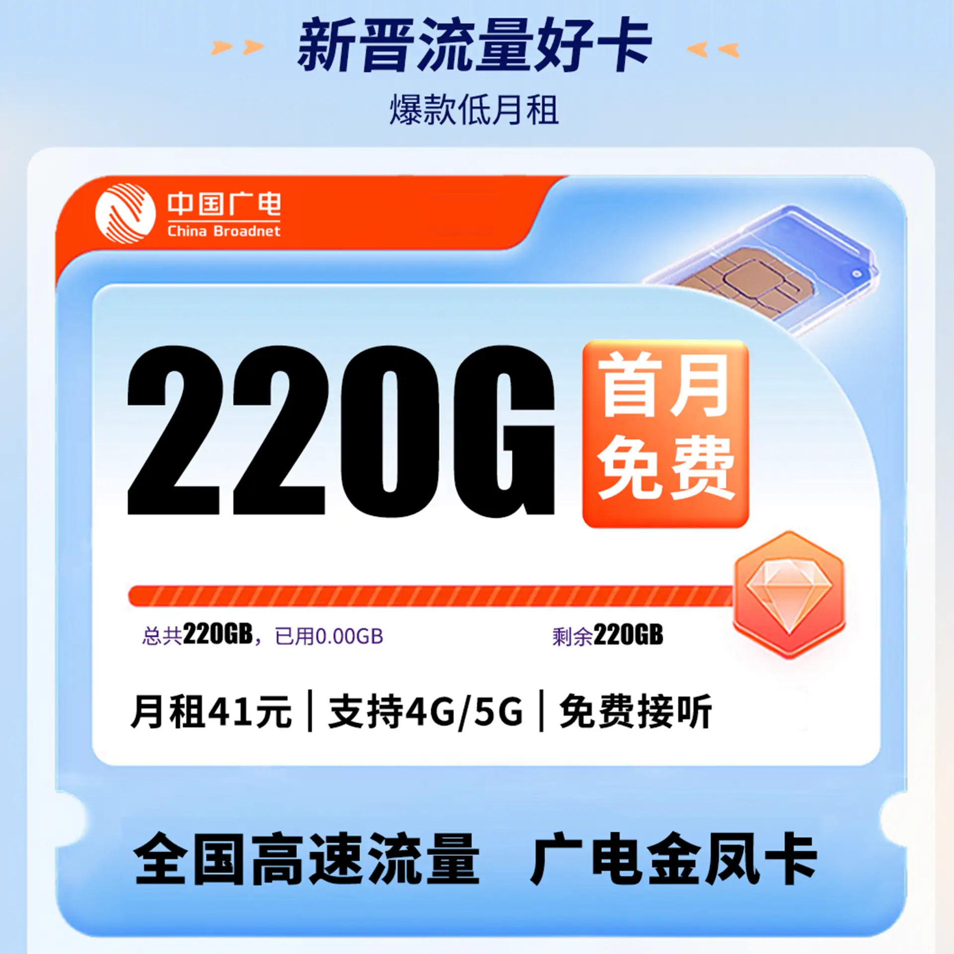 广电金凤卡41元220G通用流量+可办副卡+可发全国!